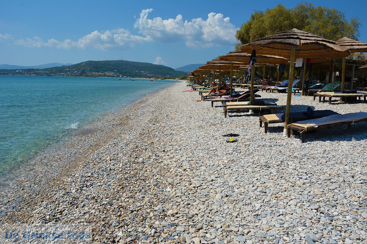 Agios Konstantinos. Agios Konstantinos is a coastal village on the Greek island of Samos. It is located about 21 kilometres west of Samos town on the route to Karlovassi. The village is surrounded by a green environment and the slopes are well-covered with trees, vines and shrubs.